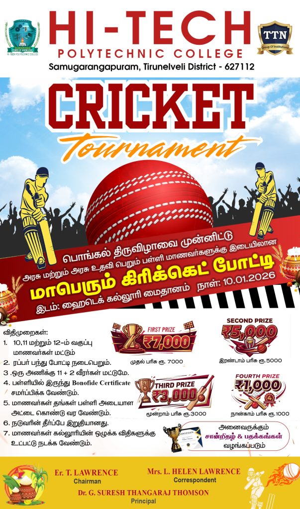 HI-TECH POLYTECHNIC COLLEGE was established in 2010. It is a State-Government-Aided institution. It is a co-educational institution. The medium of instruction is in English and Tamil. It offers three-year full-time Diploma courses in Civil, Mechanical, EEE, ECE. All the courses are approved by the AICTE and the Directorate of Technical Education, Government of Tamilnadu. The polytechnic is situated in an area of 120 acres with a built-in area of about 12000 sq M having spacious classrooms, well-equipped laboratories, workshops and other amenities. Standard sports grounds are available for physical education.
