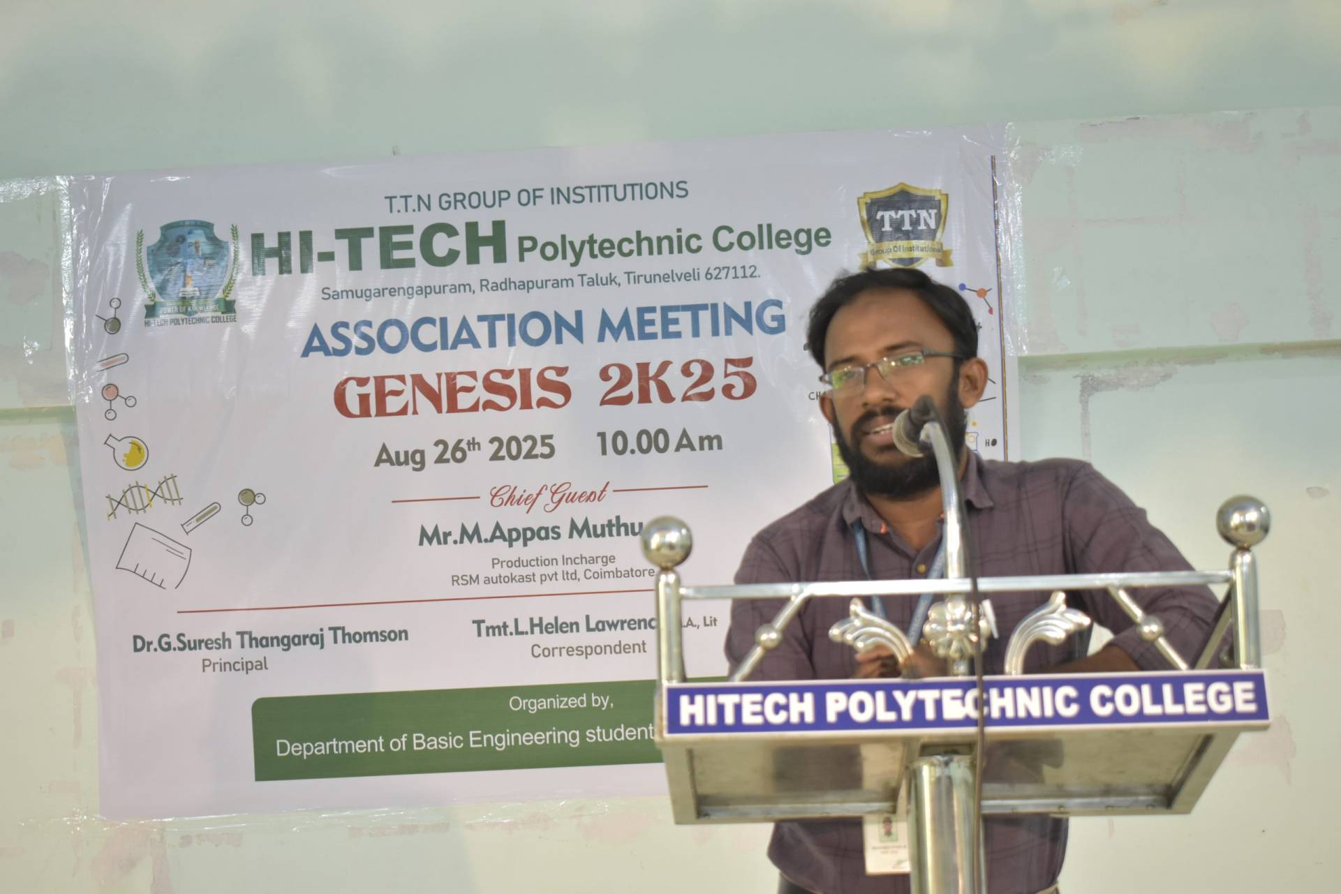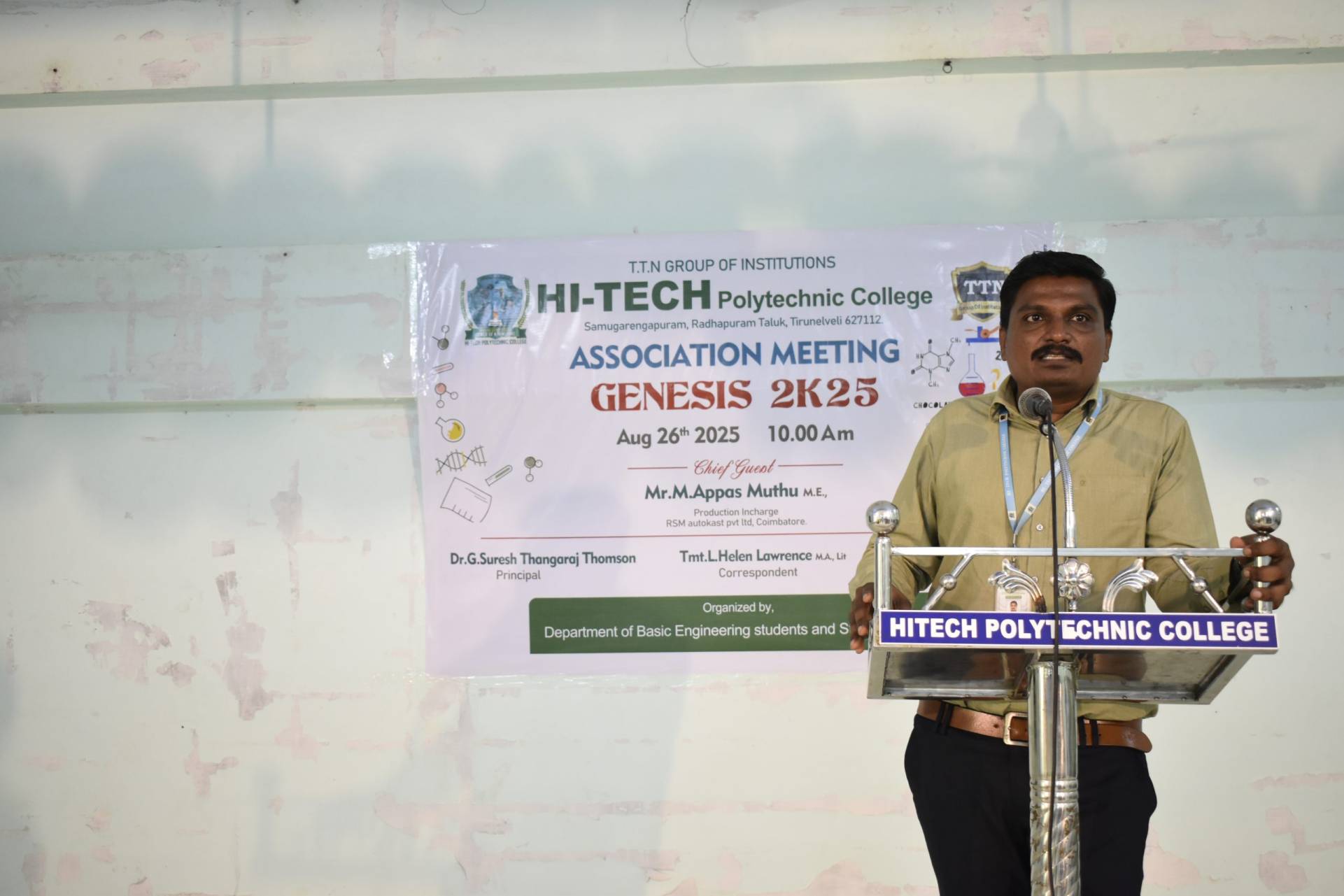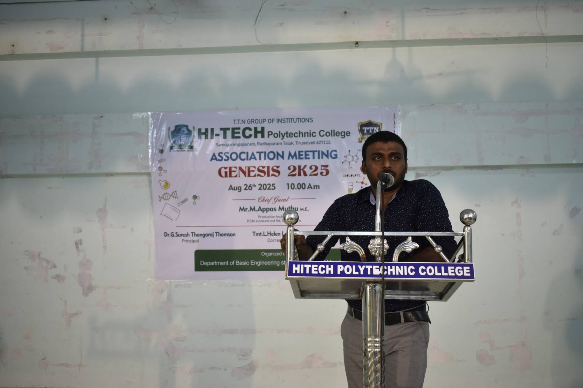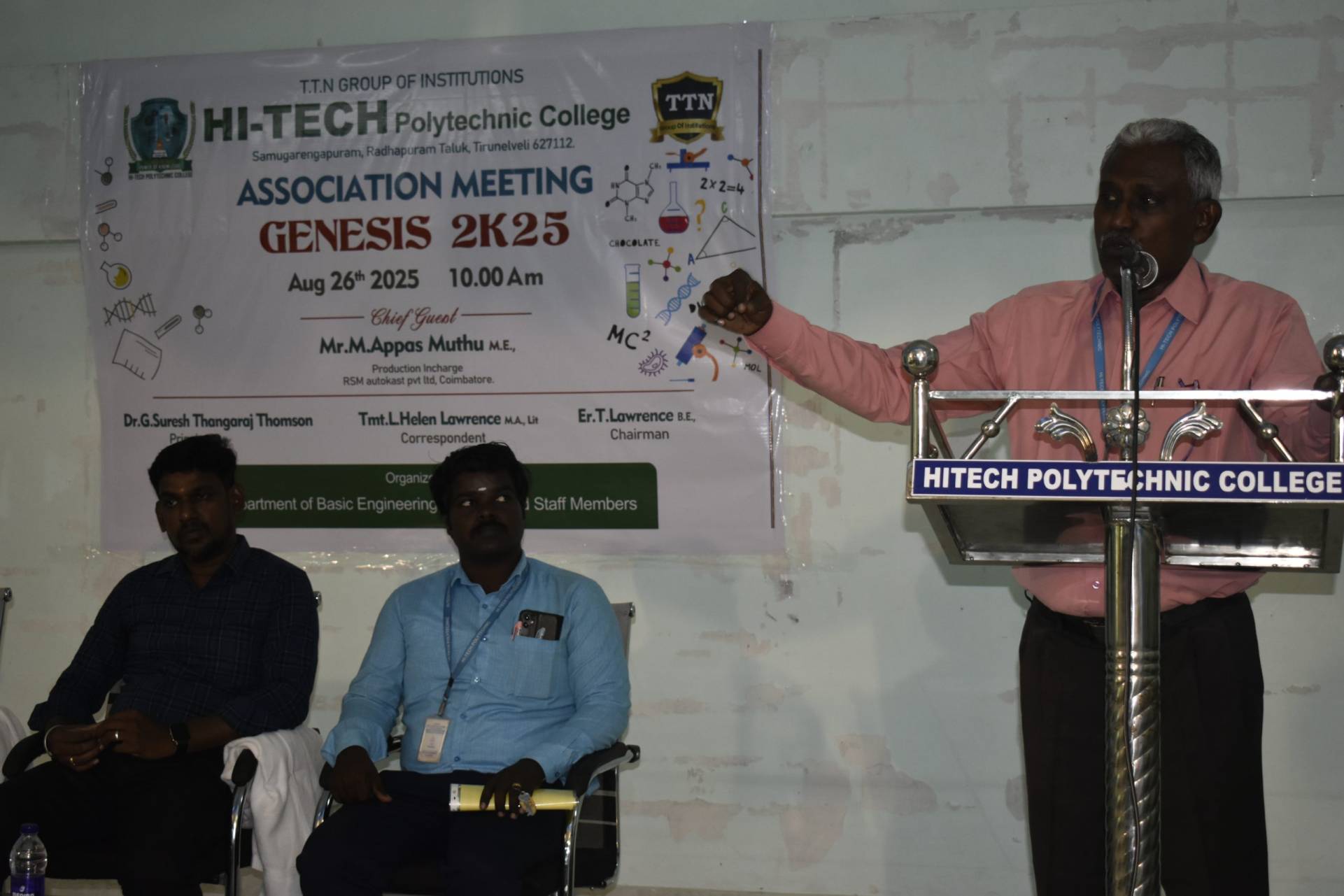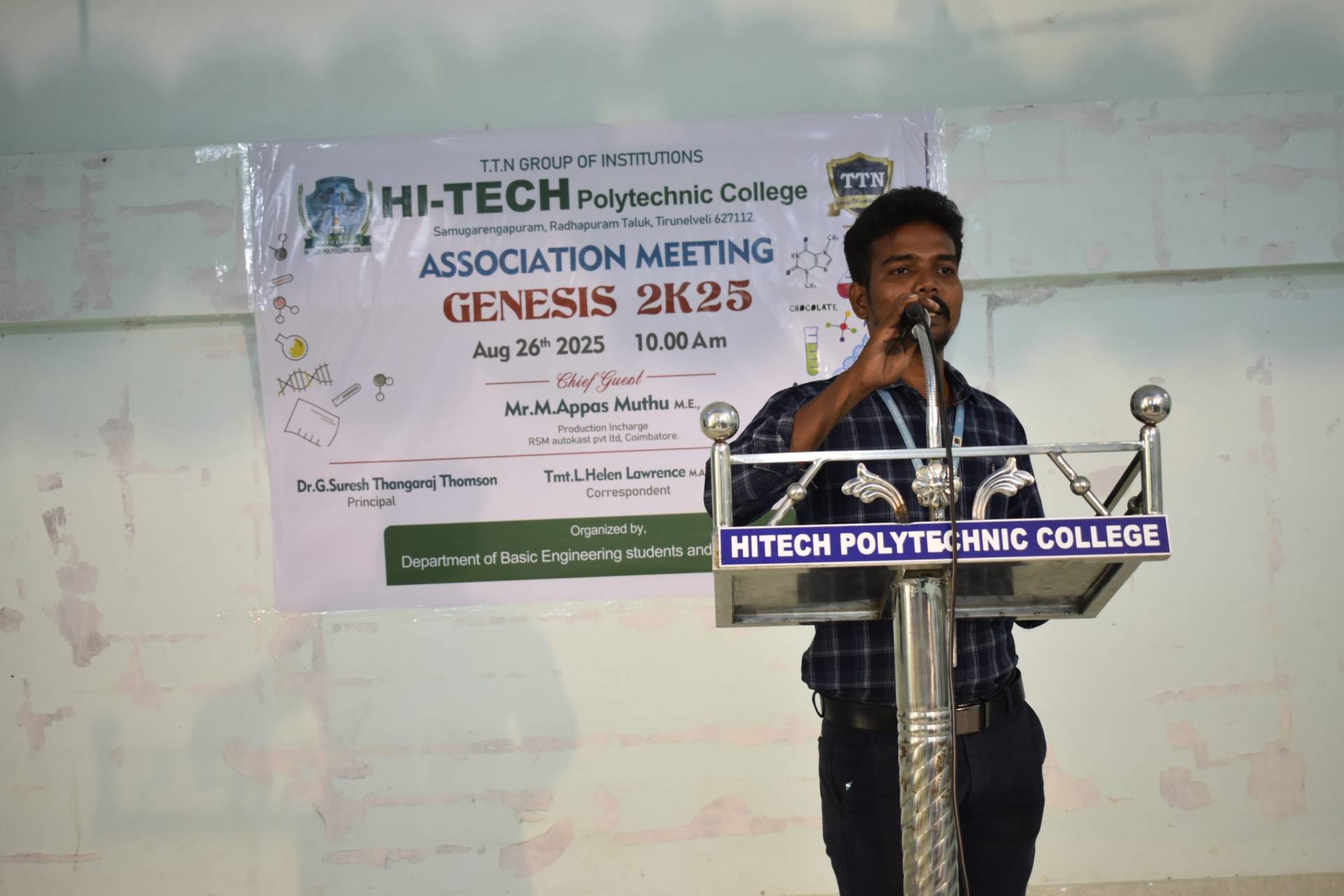 At Hi-Tech Polytechnic College located in Samugarengapuram, Tirunelveli District, the Engineers’ Association Inauguration Ceremony for first-year students was held on 26.08.2025.