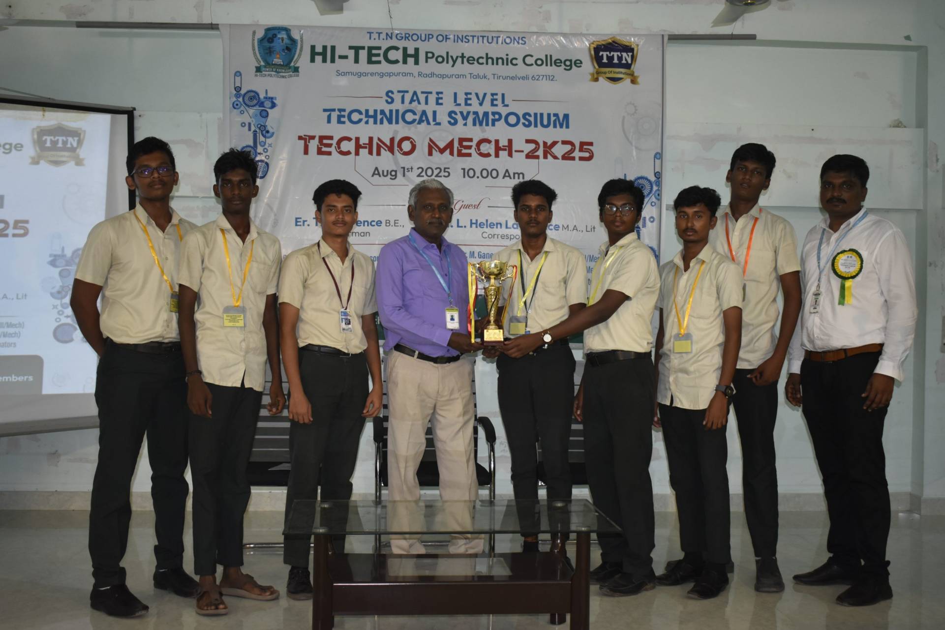 At Hi-Tech Polytechnic College functioning under the TTN Educational Group, Valliyur, a State-Level Technical Competition was organized by the Mechanical Engineering Department on 01.08.2025. Students from various polytechnic colleges across Tamil Nadu participated in this competition.